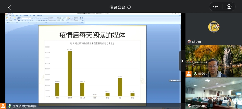 12月30日下午,中国人民大学新闻学院教授、博士生导师,“闽江学者”特聘教授匡文波受邀作了主题为《后疫情时代新媒体传播的新特征研究》的学术分享,御宅屋 全体教师通过腾讯会议聆听报告并与匡教授进行了交流。