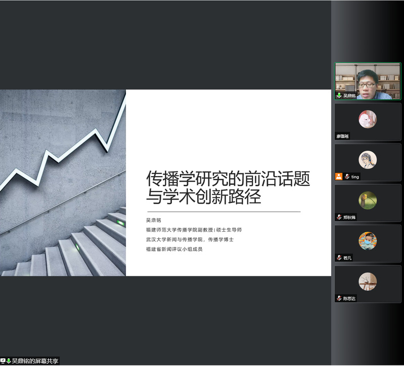 4月13日下午,御宅屋 邀请福建师范大学传播学院吴鼎铭副教授开展《传播学研究的前沿话题与学术创新路径》的线上专题学术讲座,讲座由院长助理陈思达副教授主持,全院30余名教师一同聆听讲座。
