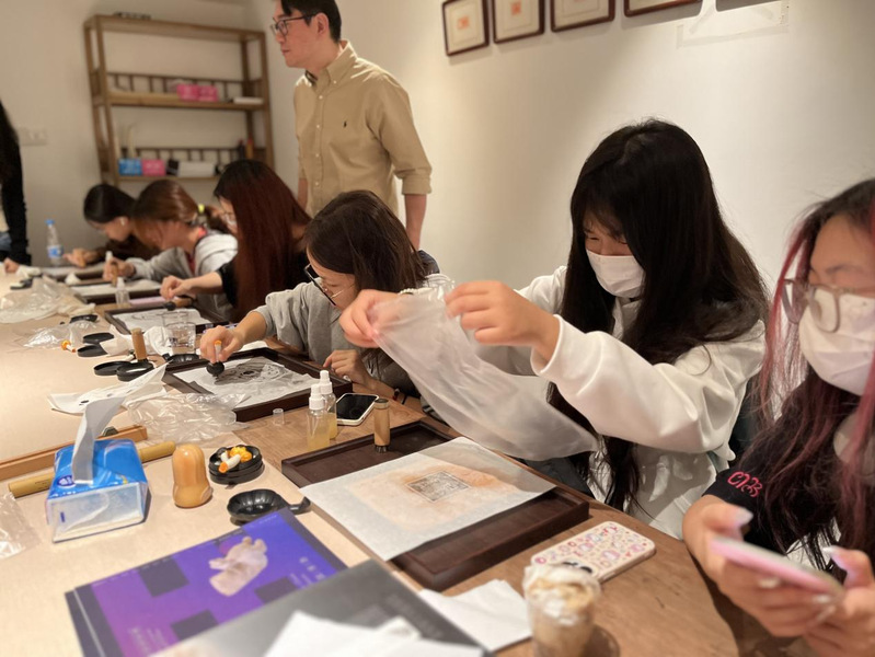 参观结束后,同学们又在博物馆工作人员的指导下,动手尝试玉器纹样拓片制作。拓片作为非遗项目,是一种古老的“复印”技艺,同学们看过工作人员的示范后便热火朝天地行动起来。喷水、覆纸、敲打纹路、吸水、印染,不多时,宣纸上便显现出玉器形状。一张薄薄的宣纸,泛起淡淡的墨香,深深浅浅的印记勾勒出玉器精美的纹路。拓片完成之后,同学们迫不及待地去展馆中寻找相对应的玉器合影留念。当拓片与文物相遇的那刻,仿佛打破了时间的屏障,实现了古与今的交流。