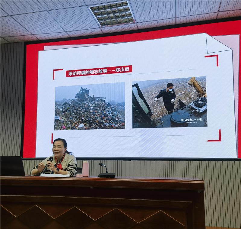 讲座伊始,李白蕾结合“共享福伞”、《全球首次!海水原位直接电解制氢》《诺恩,你还“活”着》等案例和新闻作品,生动讲解新闻采访与写作的业务知识。李白蕾带领大家一起回顾她采访过的三位劳模的感人故事,其中包括福州市红庙岭垃圾综合处理场重型特种机械操作手郑贞良、光学工艺工程师王建民、福州盲校教师陈君恩等。劳模们的敬业精神、奉献精神、创新精神和工匠精神,给同学们留下了深刻的印象。