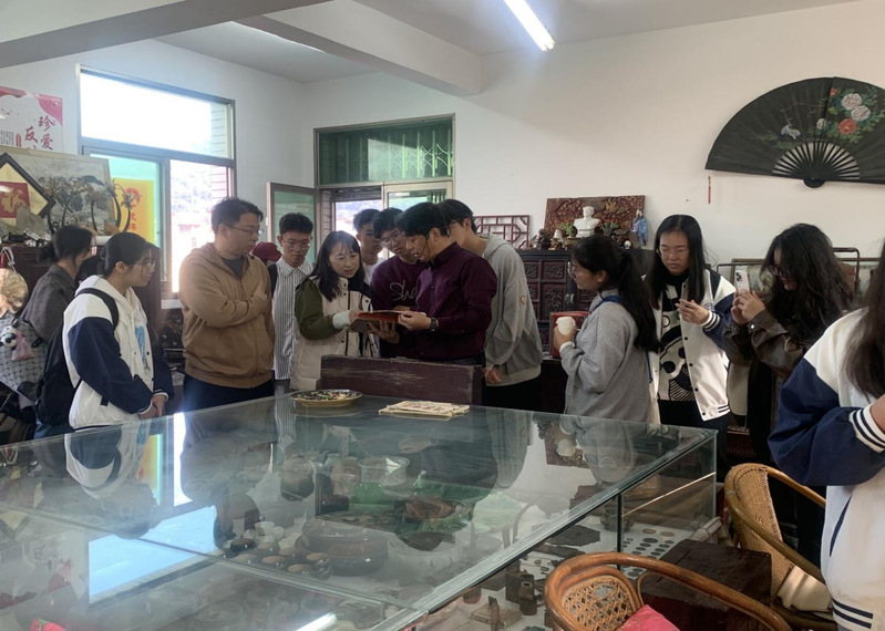 上午十点,同学们到达风景秀丽的象纬。在村总支书记谢起豪的带领下,同学们参观了象纬村民俗文化陈列馆。在约80平方米地陈列馆内,摆满了600余件乡村生活老物件,都是谢书记家中流传的旧物、个人收集和村民捐赠。谢书记声情并茂地讲述着一件件旧物背后的故事,汇聚着时光的斑驳和浓浓的乡愁;透过这些旧物,乡村的历史和空间有了具体的模样,其中承载的悲欢离合也深深感染了每一位参观者。谢书记介绍,这间小小陈列馆,已经在申报乡村博物馆项目,如果能够得到项目支持,陈列馆可以有更宽敞的空间,藏品分类陈列更科学,乡村历史和民间故事也将获得更好的记录。谢书记提到,建设民俗文化陈列室,对于乡村经济效益促进不多,但是对于象纬村人来说,却是沉淀乡村情感,唤起乡愁记忆的重要载体。乡村振兴的主体正是乡村中的人。