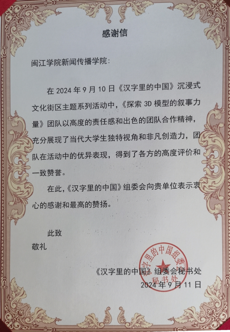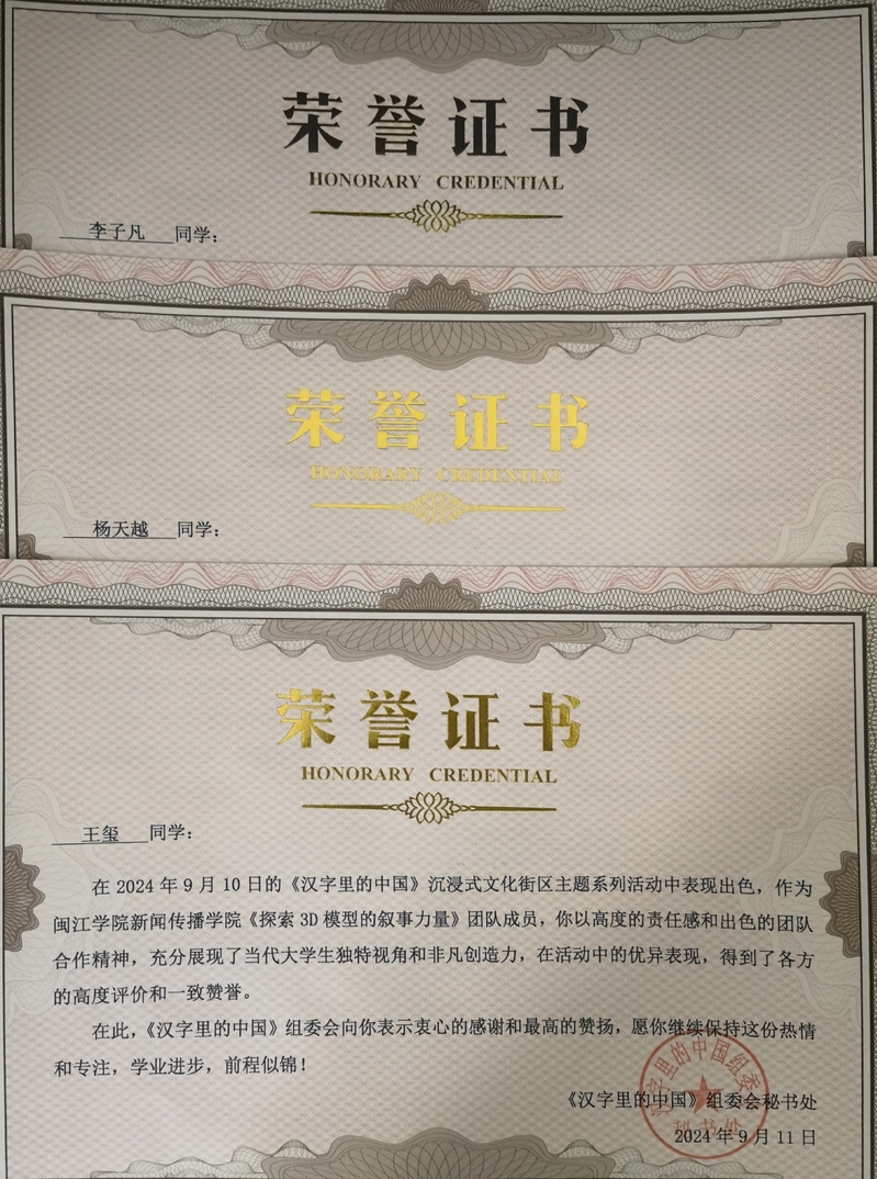2024年9月10日,御宅屋 数字媒体艺术专业21级李子凡、22级王玺、杨天越等同学参展《汉字里的中国》沉浸式国潮互动体验展,并以“探索3D模型的叙事力量”展示了御宅屋 数字媒体与创意产业学院建设重要成果及数字媒体专业应用型教育成效,得到多方关注和肯定。