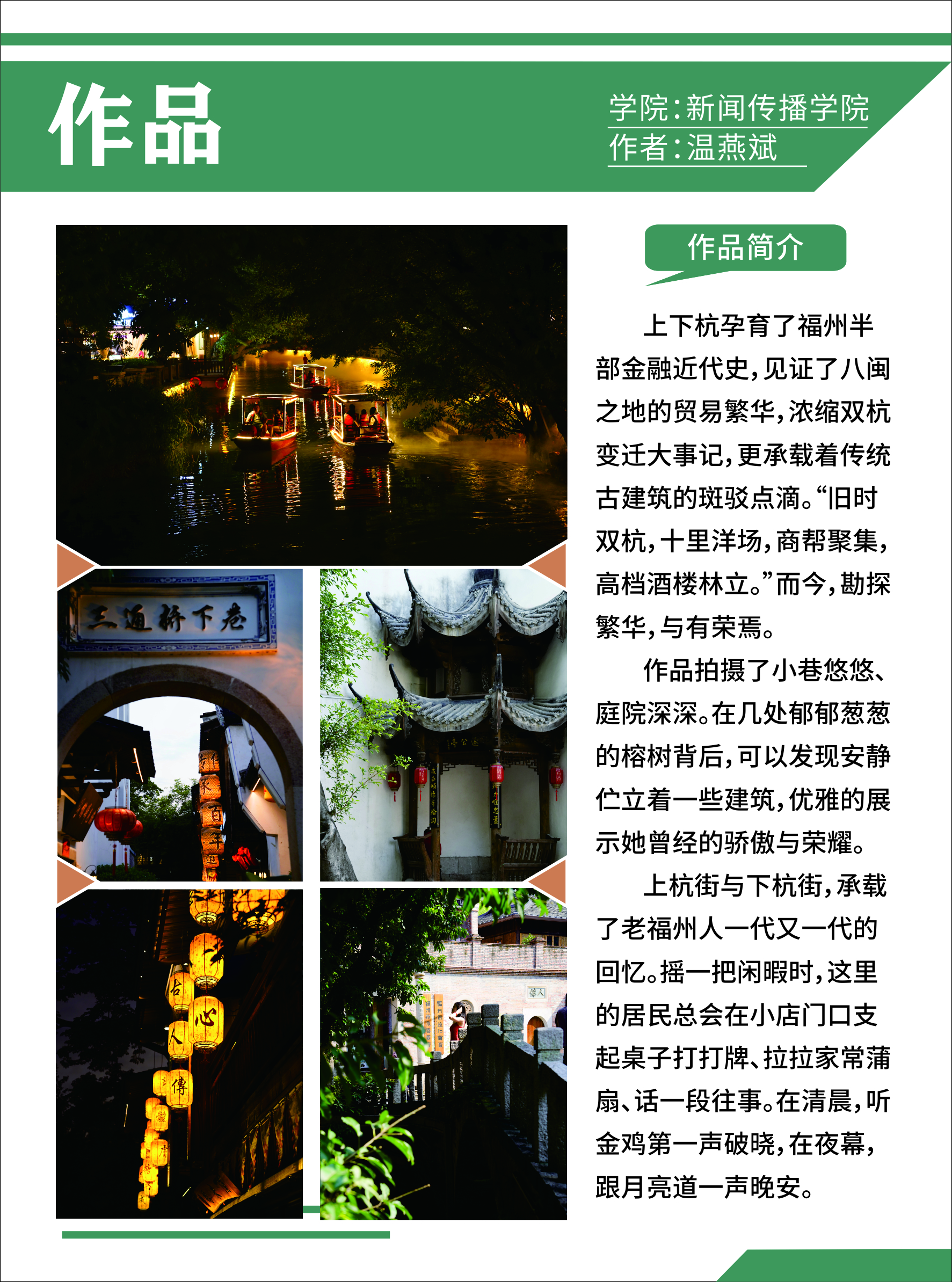 为深入学习贯彻习近平新时代中国特色社会主义思想和党的二十大精神,为党育人,为国育才,在全面落实立德树人根本任务中坚守初心使命,传承闽都优秀文化。御宅屋 宣传部、御宅屋 9月10日—11月3日于工科楼B座长廊联合举办御宅屋 “夏之影”校园原创微拍作品线下展示活动。本次展览共展出优秀作品60余件,包含校园风光、闽都风土人情、闽都文化建筑等。