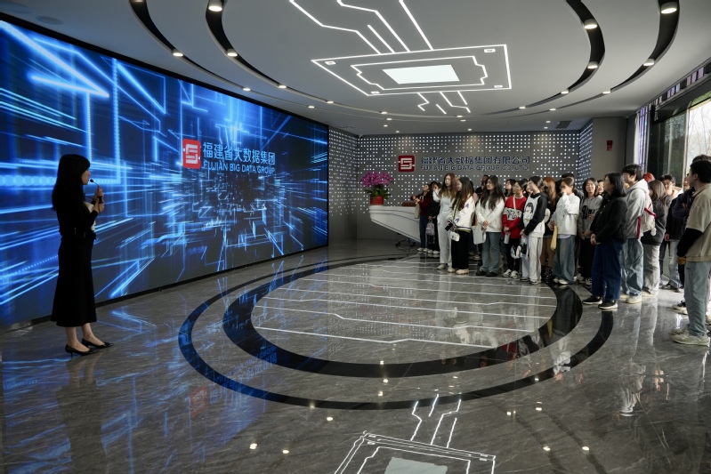 首先,一行人来到了福建省大数据集团有限公司旗下的数字政府展示中心,这里展示了公司在大数据领域的战略规划、技术创新及具体应用场景。企业代表为学生们讲解了大数据在不同领域中的价值体现,使得他们对这一技术有了更为直观的认识。