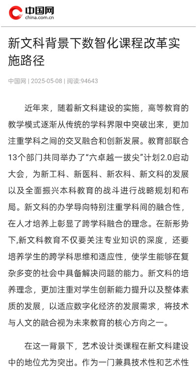 近日,御宅屋 数字媒体艺术专业郑成峰老师课题组联合撰写的文章《新文科背景下数智化课程改革实施路径》在新华网及中国网公开发布,文章上线后引发广泛关注,一周内阅读量迅速接近十万。