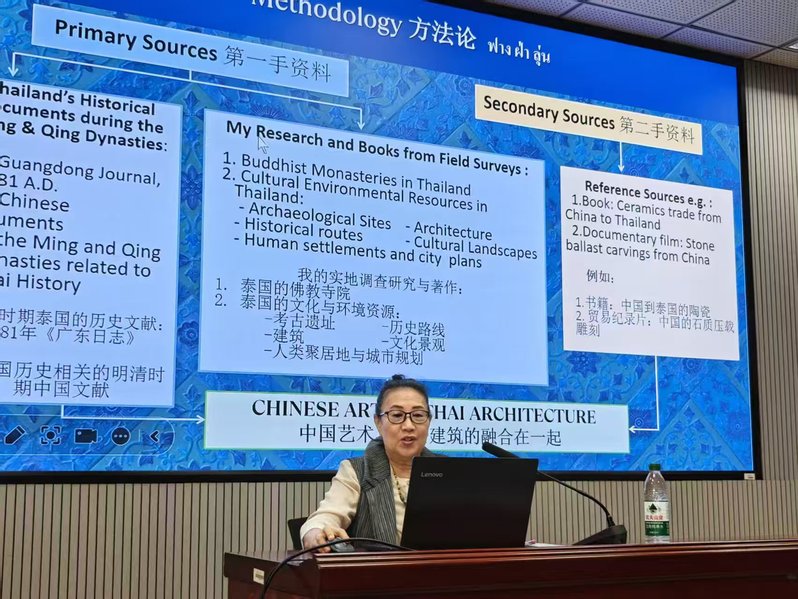 在讲座中,苏德谭教授以其丰富的实地考察和修复项目为基础,通过大量珍贵的图片资料和建筑图解,系统阐述了中国艺术元素在泰国,特别是泰国东北部地区建筑遗产中的体现与融合。她指出,这种文化影响并非孤立存在,而是深深植根于历史悠久的商业与文化交流之中。她特别提到了自己向ICOMOS提交的关于“盐路”(The Salt Route)作为世界文化遗产的价值研究,这条古代贸易路线是连接泰国与邻国文化交流的重要廊带,也成为了中华艺术元素传播的途径之一。