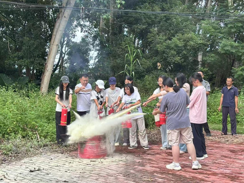 在消防实操环节,在保卫处工作人员的指导下,同学们分组、规范使用灭火器扑灭明火,学习灭火器的操作技能。