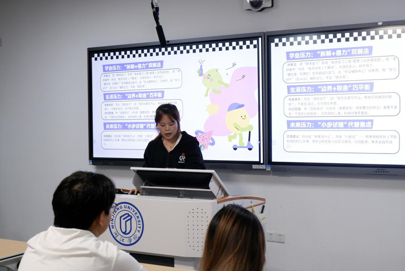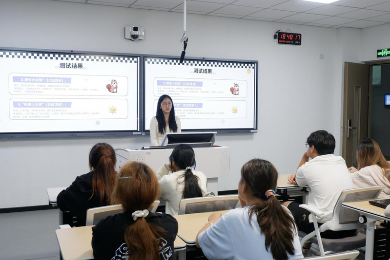讲座中主讲人魏诗洵重点分享了情绪调节技巧与压力应对方法,为学生释放情绪压力提供了可行途径。此外,现场还设置了“情绪压力小测评” 互动环节:通过 10 道贴近校园生活的情境题,针对不同性格特点的学生提供专属建议,并赋予 “焦虑小刺猬”“理性小松鼠” 等形象化标签。这种方式让学生对近期情绪状态形成初步认知,既亲切易懂,又具有实际指导意义。
